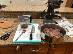 Add your ground meat back into the dutch oven/pot and pour some of the au jus over the meat. You DON'T want it soupy, just enough to sort of moisten the meat. Reserve any leftover au jus for later if you need it or for making a beef broth based soup/stew etc.